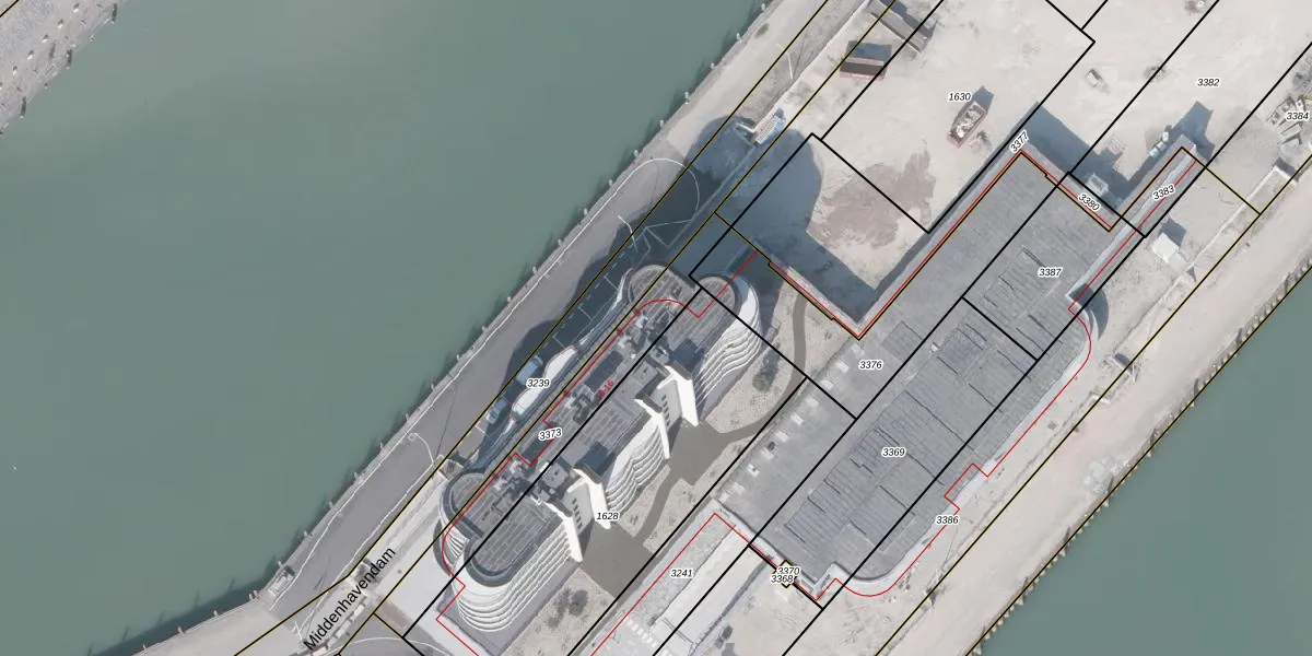 Het perceel waarop Middenhavendam 16 staat heeft een oppervlakte van 447 m². Dit is een groot perceel. De perceeloppervlakte wordt geregistreerd door het Kadaster. Gedetailleerde informatie over de maten van dit perceel kunt u vinden in het rapport Kadastrale kaart met maatvoering van Middenhavendam 16.