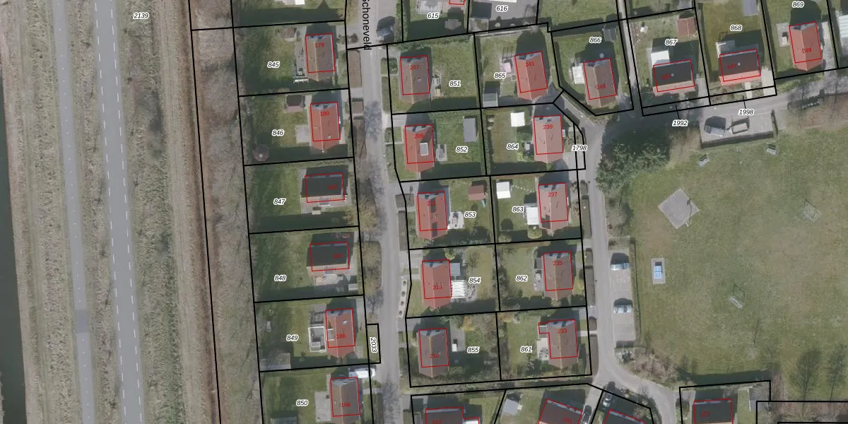 Schoneveld 211 is gelegen op kadastraal perceel OBG00EL853. Deze kadastrale aanduiding is uniek en wordt gebruikt door het Kadaster om eigendomsrechten en andere zakelijke rechten vast te leggen. Het perceel maakt onderdeel uit van de kadastrale gemeente Oostburg.