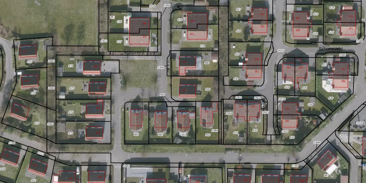 Het perceel waarop Schoneveld 325 staat heeft een oppervlakte van 357 m². Dit is een groot perceel. De perceeloppervlakte wordt geregistreerd door het Kadaster. Gedetailleerde informatie over de maten van dit perceel kunt u vinden in het rapport Kadastrale kaart met maatvoering van Schoneveld 325.