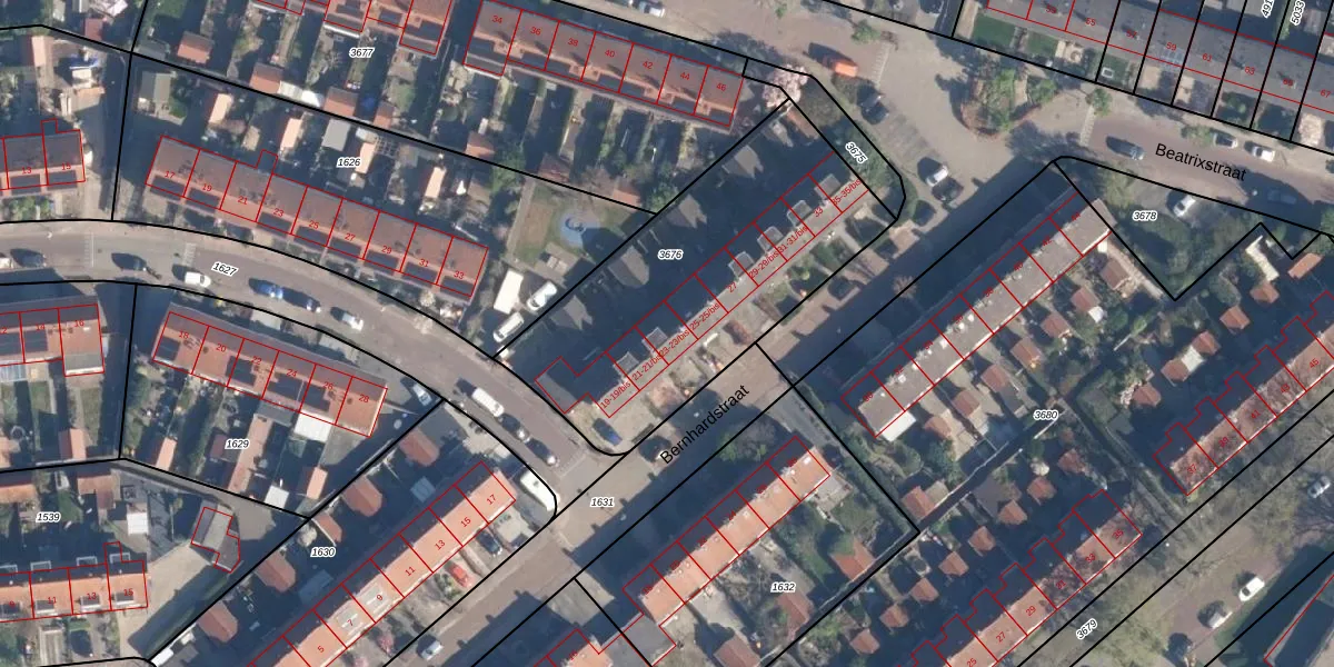 Het perceel waarop Bernhardstraat 23-bis staat heeft een oppervlakte van 1380 m². Dit is een zeer groot perceel. De perceeloppervlakte wordt geregistreerd door het Kadaster. Gedetailleerde informatie over de maten van dit perceel kunt u vinden in het rapport Kadastrale kaart met maatvoering van Bernhardstraat 23-bis.