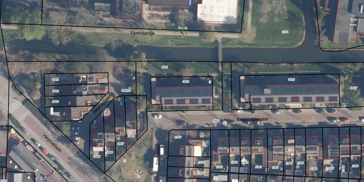 Het perceel waarop Bisschopswater 68 staat heeft een oppervlakte van 608 m². Dit is een groot perceel. De perceeloppervlakte wordt geregistreerd door het Kadaster. Gedetailleerde informatie over de maten van dit perceel kunt u vinden in het rapport Kadastrale kaart met maatvoering van Bisschopswater 68.
