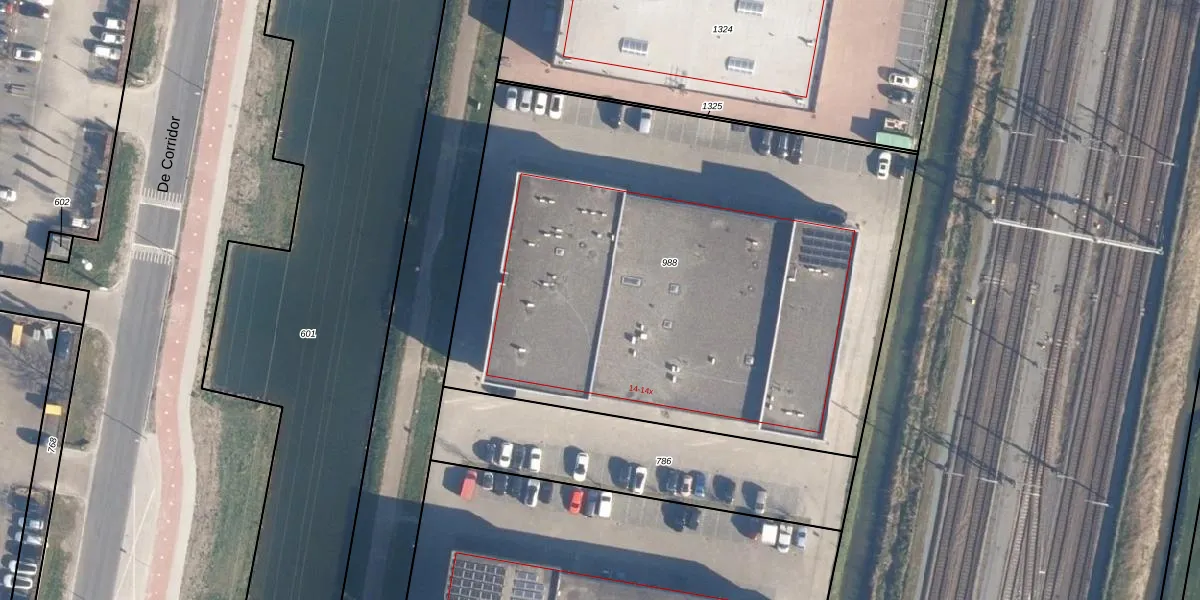 Het perceel waarop De Corridor 14-d staat heeft een oppervlakte van 3650 m². Dit is een zeer groot perceel. De perceeloppervlakte wordt geregistreerd door het Kadaster. Gedetailleerde informatie over de maten van dit perceel kunt u vinden in het rapport Kadastrale kaart met maatvoering van De Corridor 14-d.