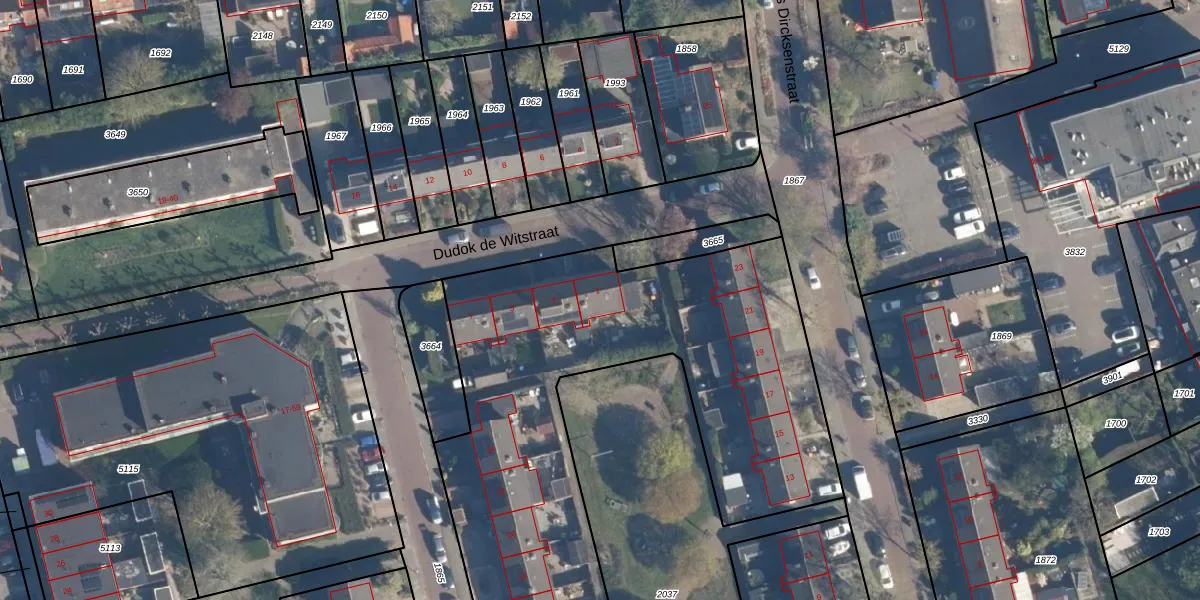 Het perceel waarop Dudok de Witstraat 1 staat heeft een oppervlakte van 5380 m². Dit is een zeer groot perceel. De perceeloppervlakte wordt geregistreerd door het Kadaster. Gedetailleerde informatie over de maten van dit perceel kunt u vinden in het rapport Kadastrale kaart met maatvoering van Dudok de Witstraat 1.