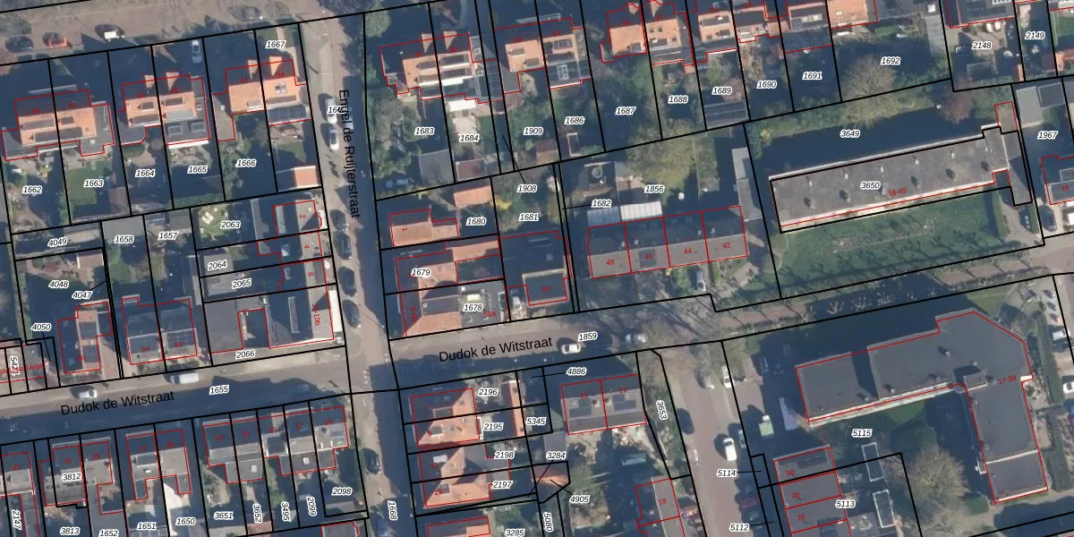 Het perceel waarop Dudok de Witstraat 50 staat heeft een oppervlakte van 335 m². Dit is een groot perceel. De perceeloppervlakte wordt geregistreerd door het Kadaster. Gedetailleerde informatie over de maten van dit perceel kunt u vinden in het rapport Kadastrale kaart met maatvoering van Dudok de Witstraat 50.