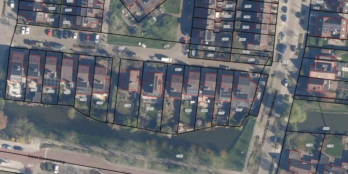 Het perceel waarop Griftenstein 44 staat heeft een oppervlakte van 390 m². Dit is een groot perceel. De perceeloppervlakte wordt geregistreerd door het Kadaster. Gedetailleerde informatie over de maten van dit perceel kunt u vinden in het rapport Kadastrale kaart met maatvoering van Griftenstein 44.