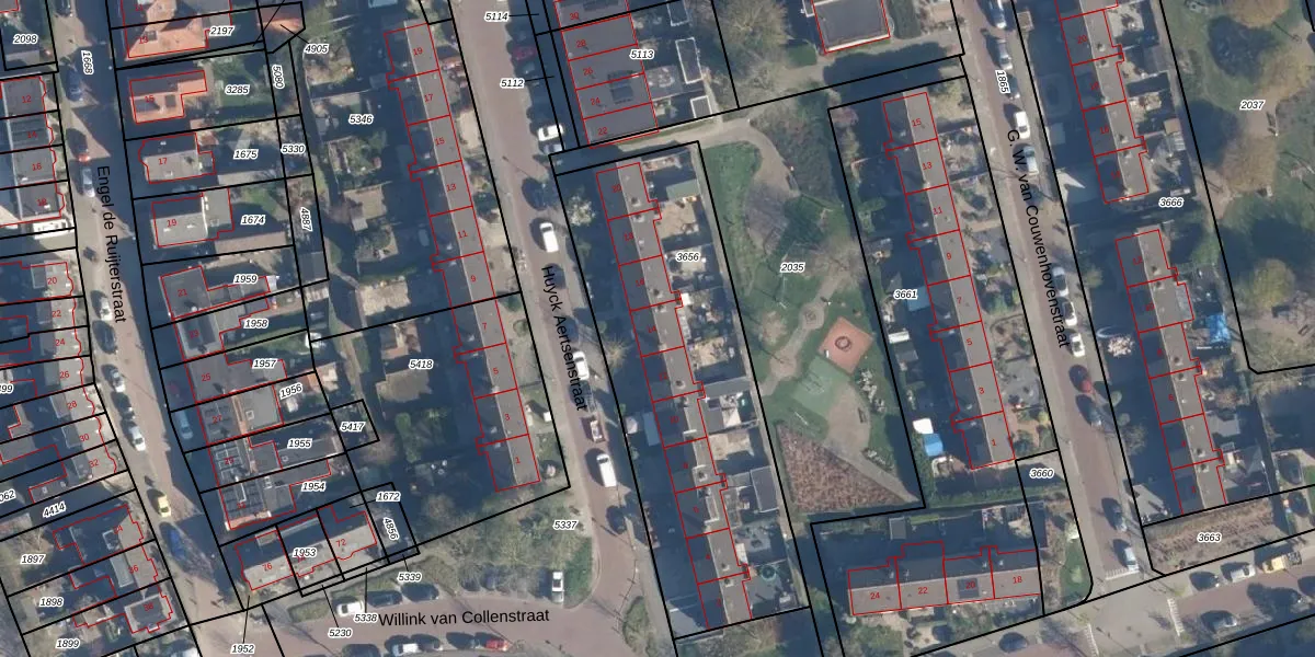Het perceel waarop Huyck Aertsenstraat 14 staat heeft een oppervlakte van 1575 m². Dit is een zeer groot perceel. De perceeloppervlakte wordt geregistreerd door het Kadaster. Gedetailleerde informatie over de maten van dit perceel kunt u vinden in het rapport Kadastrale kaart met maatvoering van Huyck Aertsenstraat 14.