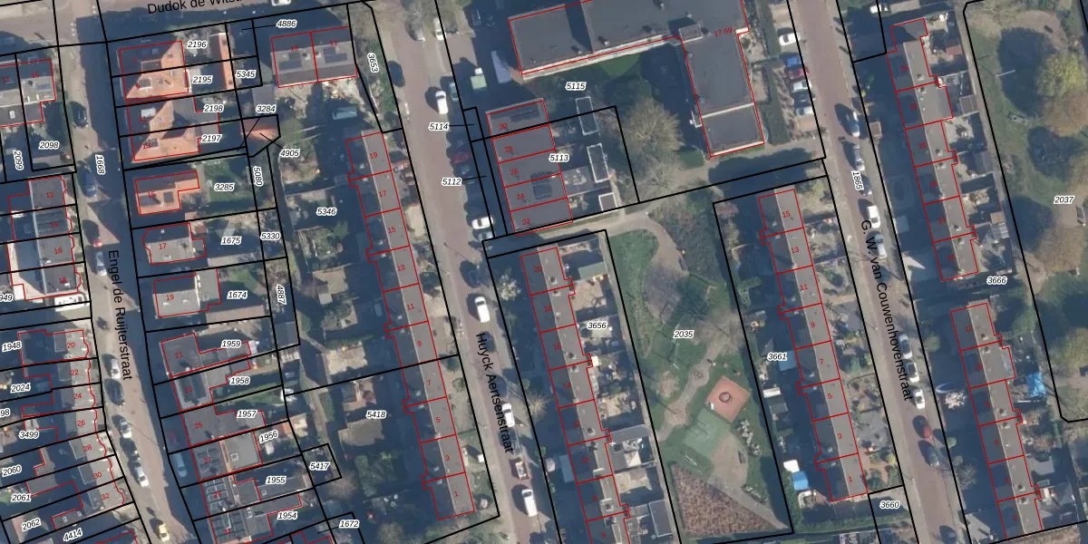 Het perceel waarop Huyck Aertsenstraat 20 staat heeft een oppervlakte van 1575 m². Dit is een zeer groot perceel. De perceeloppervlakte wordt geregistreerd door het Kadaster. Gedetailleerde informatie over de maten van dit perceel kunt u vinden in het rapport Kadastrale kaart met maatvoering van Huyck Aertsenstraat 20.