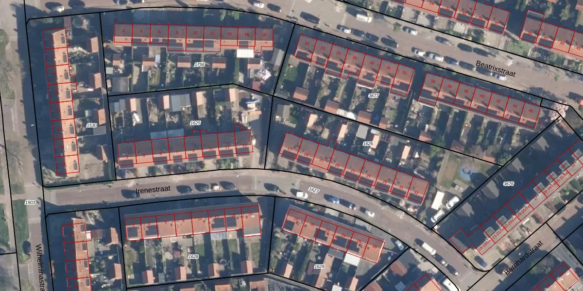 Het perceel waarop Irenestraat 17 staat heeft een oppervlakte van 1745 m². Dit is een zeer groot perceel. De perceeloppervlakte wordt geregistreerd door het Kadaster. Gedetailleerde informatie over de maten van dit perceel kunt u vinden in het rapport Kadastrale kaart met maatvoering van Irenestraat 17.