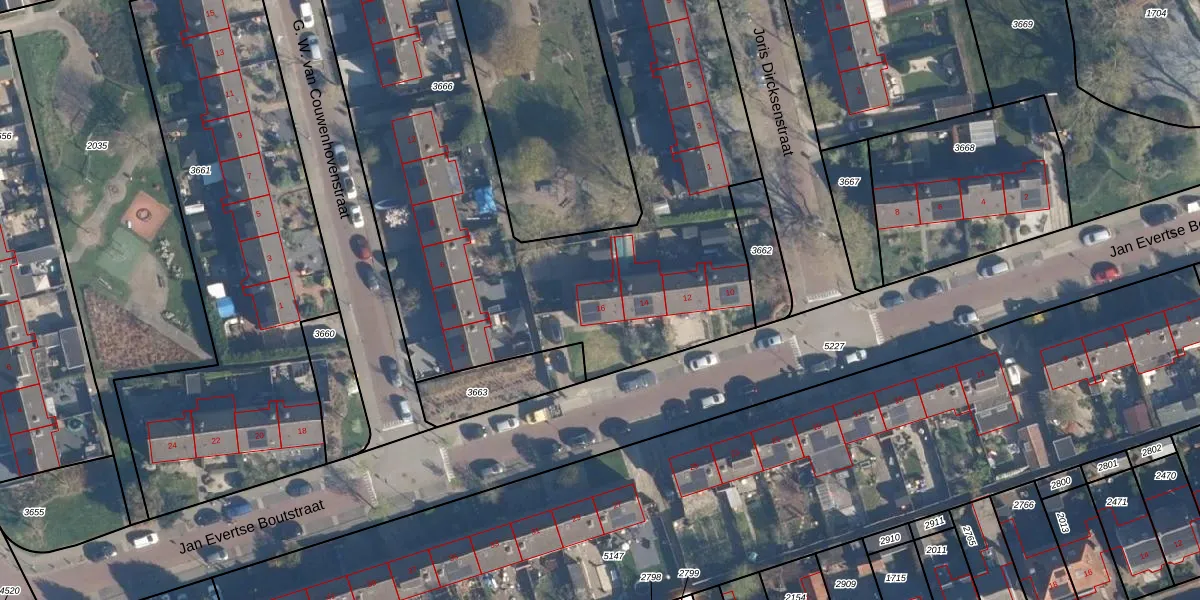 Jan Evertse Boutstraat 16 is gelegen op kadastraal perceel BKL07B3666. Deze kadastrale aanduiding is uniek en wordt gebruikt door het Kadaster om eigendomsrechten en andere zakelijke rechten vast te leggen. Het perceel maakt onderdeel uit van de kadastrale gemeente Breukelen-Nijenrode.