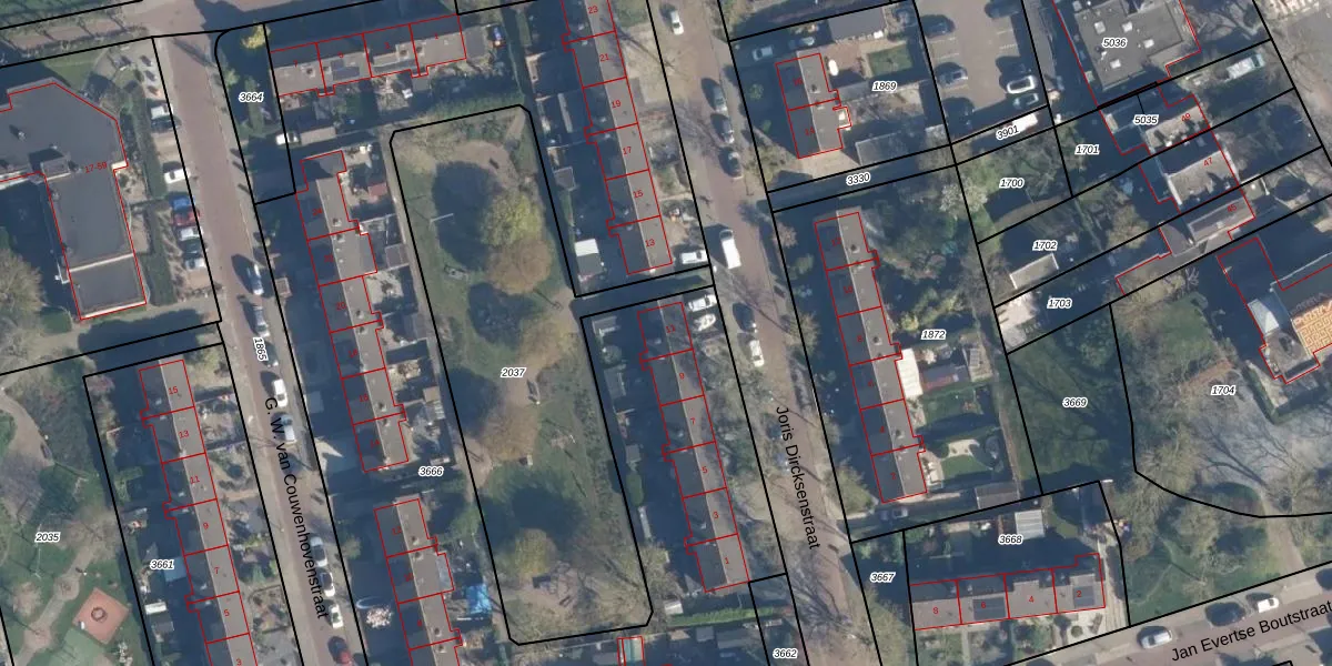 Het perceel waarop Joris Dircksenstraat 11 staat heeft een oppervlakte van 5380 m². Dit is een zeer groot perceel. De perceeloppervlakte wordt geregistreerd door het Kadaster. Gedetailleerde informatie over de maten van dit perceel kunt u vinden in het rapport Kadastrale kaart met maatvoering van Joris Dircksenstraat 11.