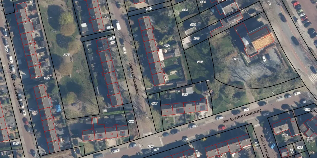 Het perceel waarop Joris Dircksenstraat 2 staat heeft een oppervlakte van 1500 m². Dit is een zeer groot perceel. De perceeloppervlakte wordt geregistreerd door het Kadaster. Gedetailleerde informatie over de maten van dit perceel kunt u vinden in het rapport Kadastrale kaart met maatvoering van Joris Dircksenstraat 2.