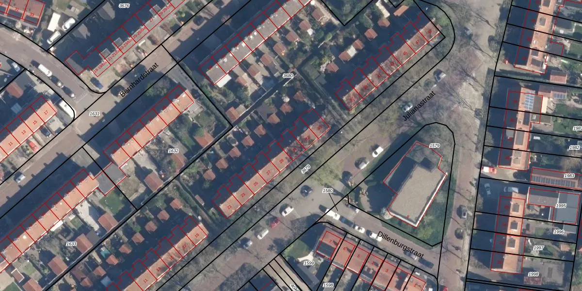 Het perceel waarop Julianastraat 31 staat heeft een oppervlakte van 5735 m². Dit is een zeer groot perceel. De perceeloppervlakte wordt geregistreerd door het Kadaster. Gedetailleerde informatie over de maten van dit perceel kunt u vinden in het rapport Kadastrale kaart met maatvoering van Julianastraat 31.
