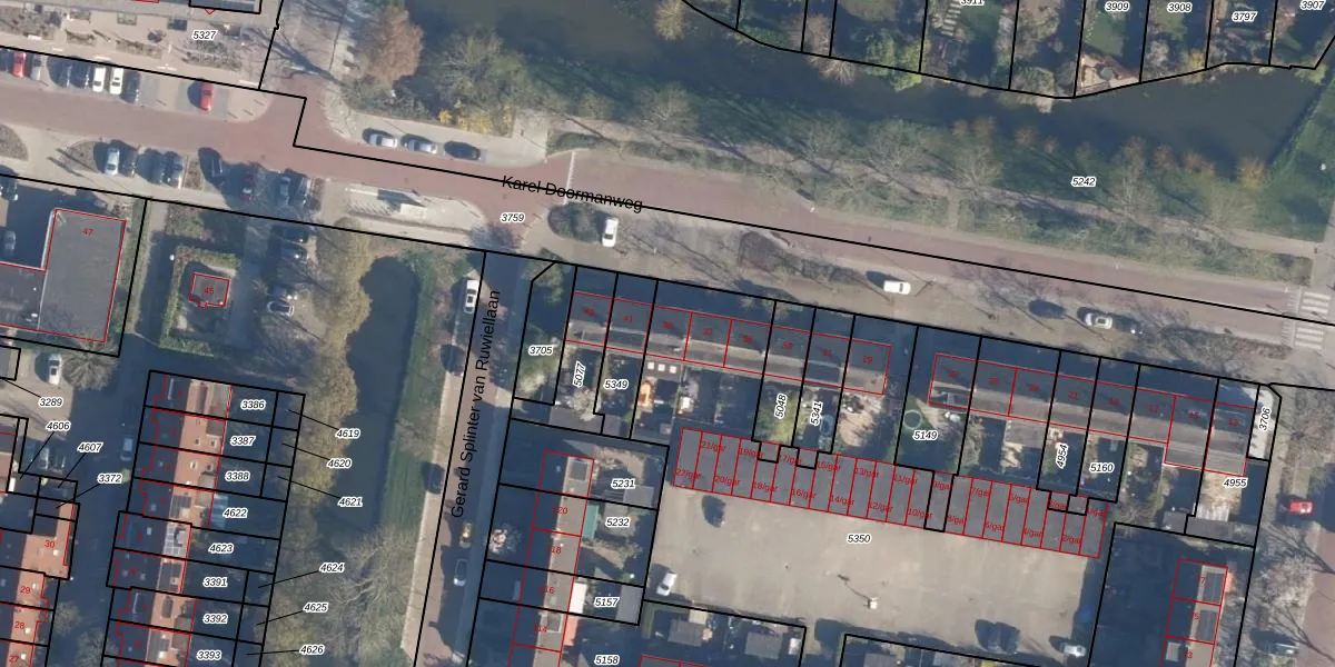Het perceel waarop Karel Doormanweg 39 staat heeft een oppervlakte van 2981 m². Dit is een zeer groot perceel. De perceeloppervlakte wordt geregistreerd door het Kadaster. Gedetailleerde informatie over de maten van dit perceel kunt u vinden in het rapport Kadastrale kaart met maatvoering van Karel Doormanweg 39.