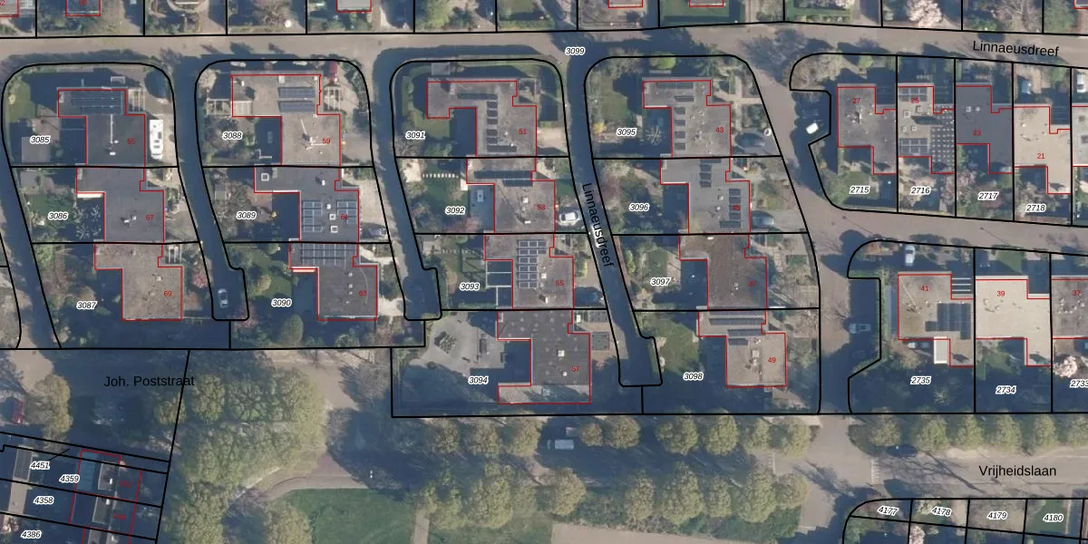 Het perceel waarop Linnaeusdreef 55 staat heeft een oppervlakte van 436 m². Dit is een groot perceel. De perceeloppervlakte wordt geregistreerd door het Kadaster. Gedetailleerde informatie over de maten van dit perceel kunt u vinden in het rapport Kadastrale kaart met maatvoering van Linnaeusdreef 55.