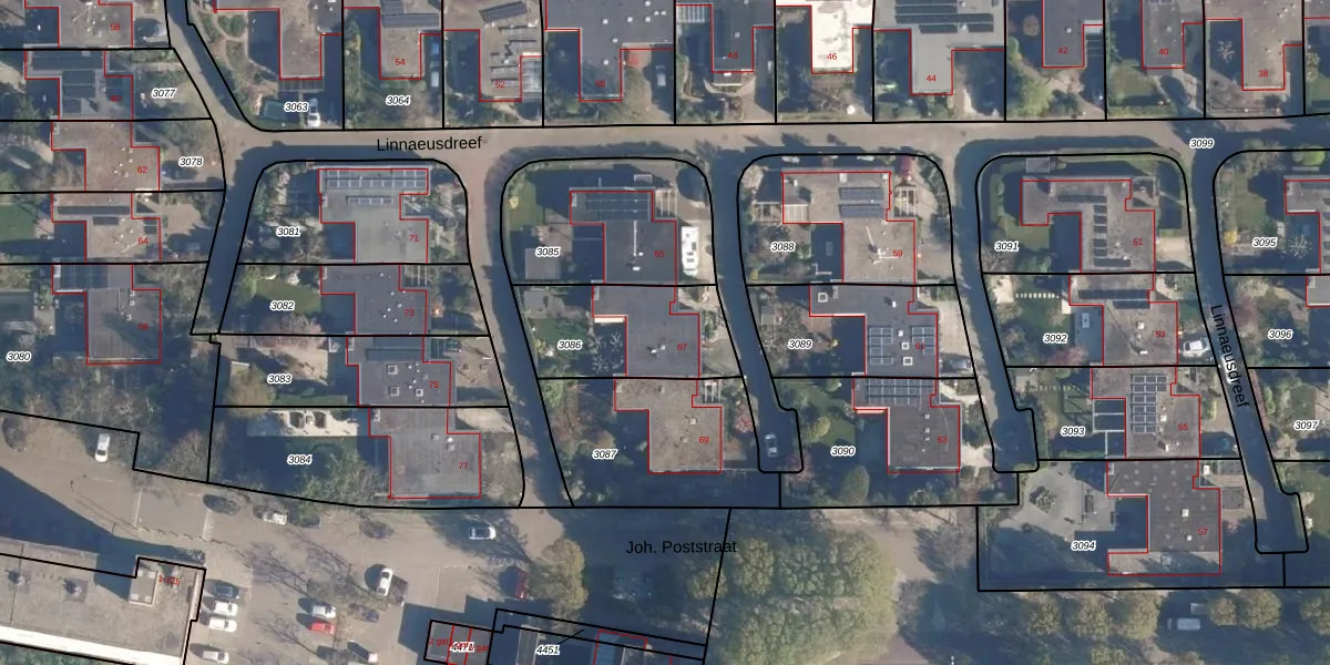 Het perceel waarop Linnaeusdreef 67 staat heeft een oppervlakte van 430 m². Dit is een groot perceel. De perceeloppervlakte wordt geregistreerd door het Kadaster. Gedetailleerde informatie over de maten van dit perceel kunt u vinden in het rapport Kadastrale kaart met maatvoering van Linnaeusdreef 67.
