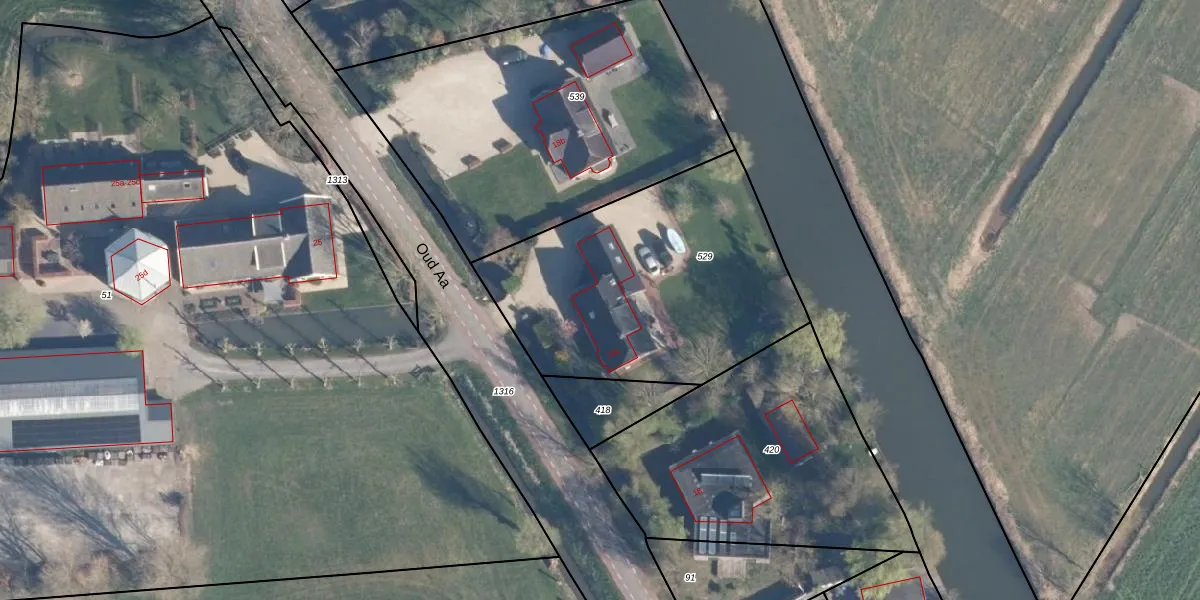 Het perceel waarop Oud Aa 18-a staat heeft een oppervlakte van 1360 m². Dit is een zeer groot perceel. De perceeloppervlakte wordt geregistreerd door het Kadaster. Gedetailleerde informatie over de maten van dit perceel kunt u vinden in het rapport Kadastrale kaart met maatvoering van Oud Aa 18-a.