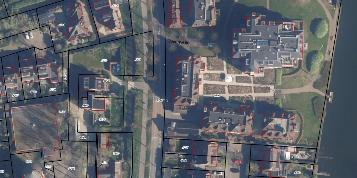 Het perceel waarop Overweer 12 staat heeft een oppervlakte van 1,0 ha. Dit is een zeer groot perceel. De perceeloppervlakte wordt geregistreerd door het Kadaster. Gedetailleerde informatie over de maten van dit perceel kunt u vinden in het rapport Kadastrale kaart met maatvoering van Overweer 12.