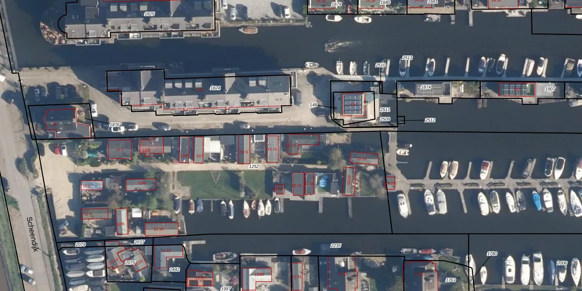Het perceel waarop Scheendijk 12-13 staat heeft een oppervlakte van 4060 m². Dit is een zeer groot perceel. De perceeloppervlakte wordt geregistreerd door het Kadaster. Gedetailleerde informatie over de maten van dit perceel kunt u vinden in het rapport Kadastrale kaart met maatvoering van Scheendijk 12-13.