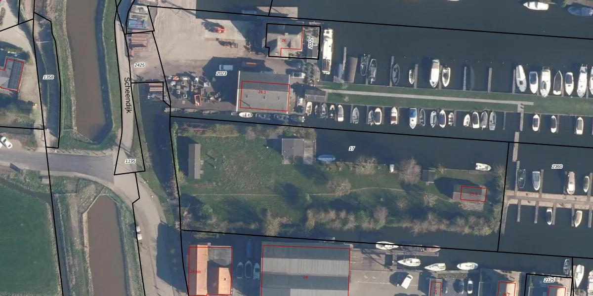 Het perceel waarop Scheendijk 25-1 staat heeft een oppervlakte van 4190 m². Dit is een zeer groot perceel. De perceeloppervlakte wordt geregistreerd door het Kadaster. Gedetailleerde informatie over de maten van dit perceel kunt u vinden in het rapport Kadastrale kaart met maatvoering van Scheendijk 25-1.