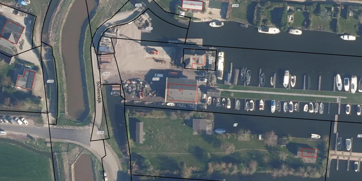 Het perceel waarop Scheendijk 26-1 staat heeft een oppervlakte van 6535 m². Dit is een zeer groot perceel. De perceeloppervlakte wordt geregistreerd door het Kadaster. Gedetailleerde informatie over de maten van dit perceel kunt u vinden in het rapport Kadastrale kaart met maatvoering van Scheendijk 26-1.