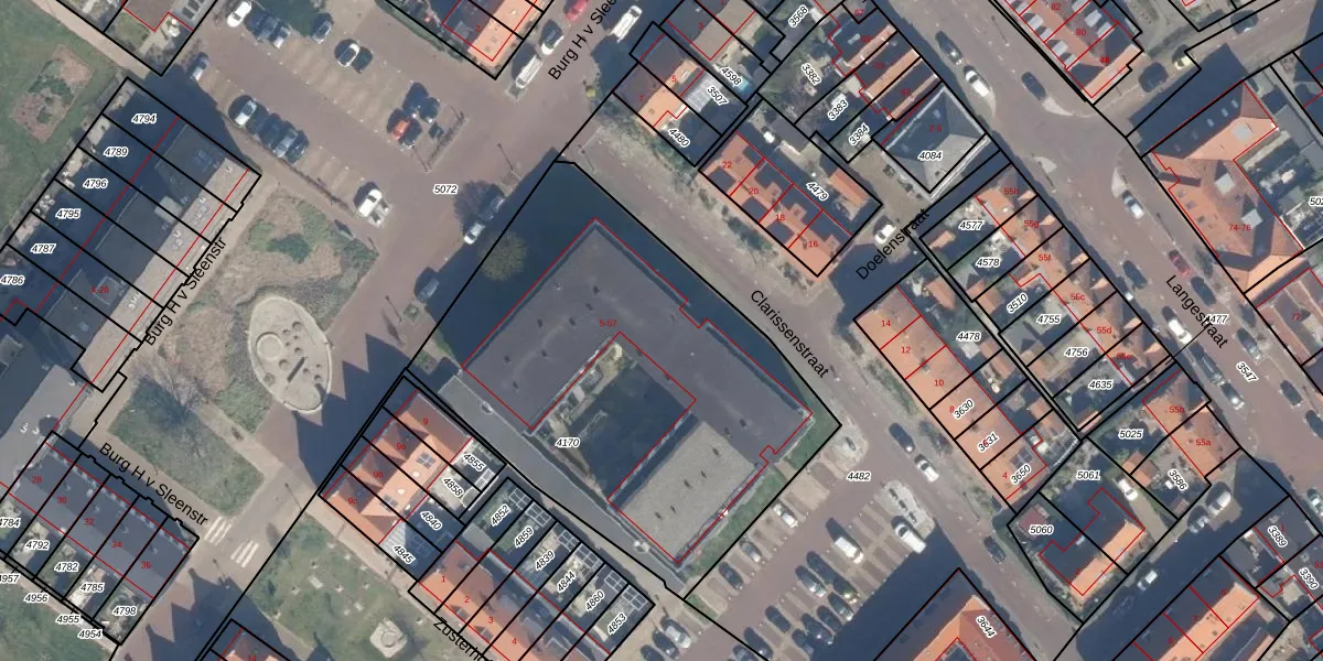 Clarissenstraat 45 is gelegen op kadastraal perceel BLE02B4170. Deze kadastrale aanduiding is uniek en wordt gebruikt door het Kadaster om eigendomsrechten en andere zakelijke rechten vast te leggen. Het perceel maakt onderdeel uit van de kadastrale gemeente Brielle.