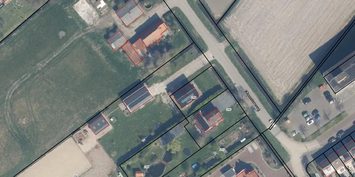 Het perceel waarop Kloosterweg 26-a staat heeft een oppervlakte van 1,2 ha. Dit is een zeer groot perceel. De perceeloppervlakte wordt geregistreerd door het Kadaster. Gedetailleerde informatie over de maten van dit perceel kunt u vinden in het rapport Kadastrale kaart met maatvoering van Kloosterweg 26-a.