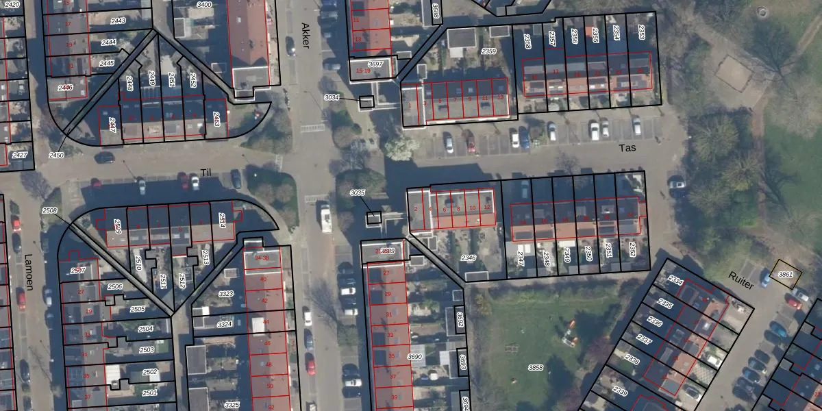 Het perceel waarop Tas 2 staat heeft een oppervlakte van 469 m². Dit is een groot perceel. De perceeloppervlakte wordt geregistreerd door het Kadaster. Gedetailleerde informatie over de maten van dit perceel kunt u vinden in het rapport Kadastrale kaart met maatvoering van Tas 2.