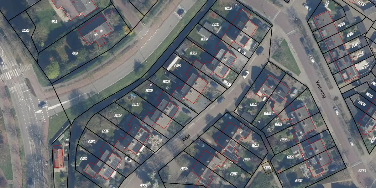 Het perceel waarop Wiel 12 staat heeft een oppervlakte van 327 m². Dit is een groot perceel. De perceeloppervlakte wordt geregistreerd door het Kadaster. Gedetailleerde informatie over de maten van dit perceel kunt u vinden in het rapport Kadastrale kaart met maatvoering van Wiel 12.