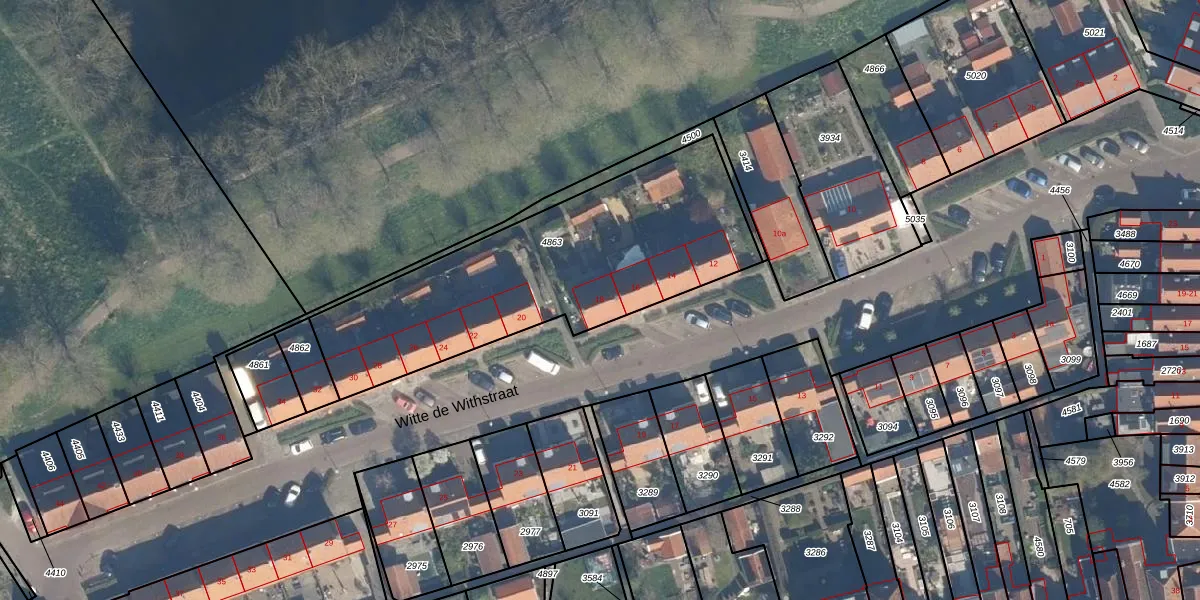 Het perceel waarop Witte de Withstraat 18 staat heeft een oppervlakte van 1381 m². Dit is een zeer groot perceel. De perceeloppervlakte wordt geregistreerd door het Kadaster. Gedetailleerde informatie over de maten van dit perceel kunt u vinden in het rapport Kadastrale kaart met maatvoering van Witte de Withstraat 18.