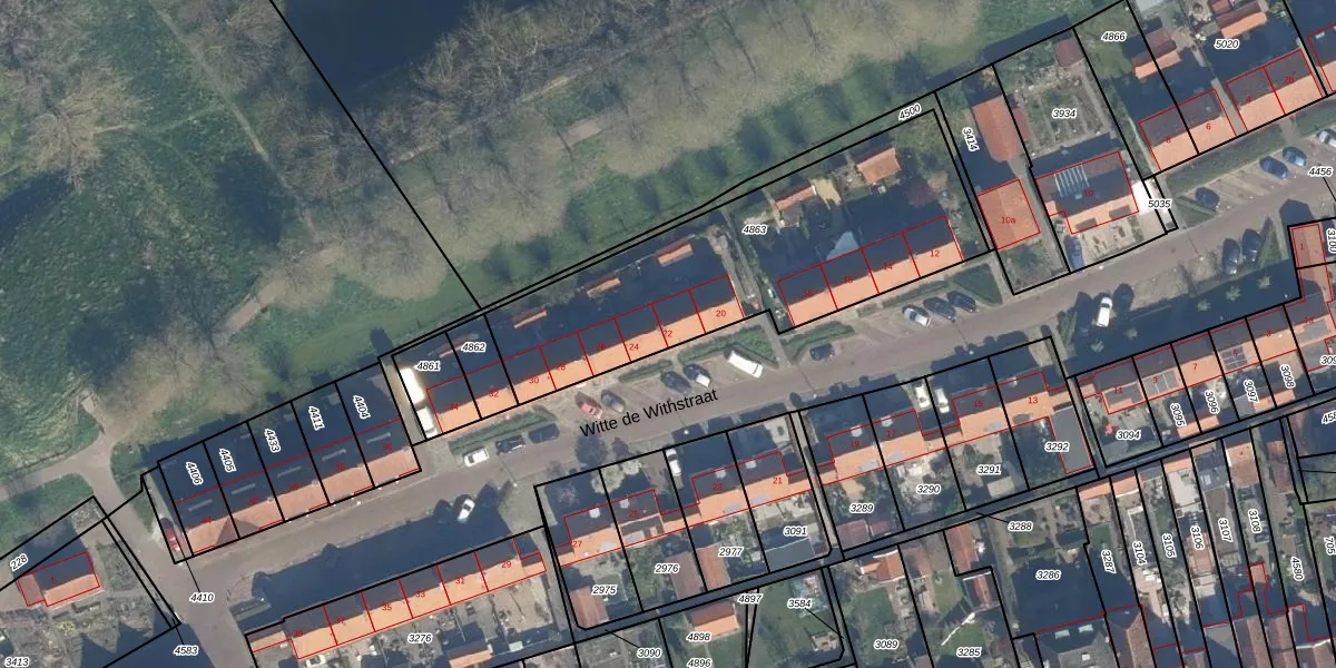 Het perceel waarop Witte de Withstraat 22 staat heeft een oppervlakte van 1381 m². Dit is een zeer groot perceel. De perceeloppervlakte wordt geregistreerd door het Kadaster. Gedetailleerde informatie over de maten van dit perceel kunt u vinden in het rapport Kadastrale kaart met maatvoering van Witte de Withstraat 22.