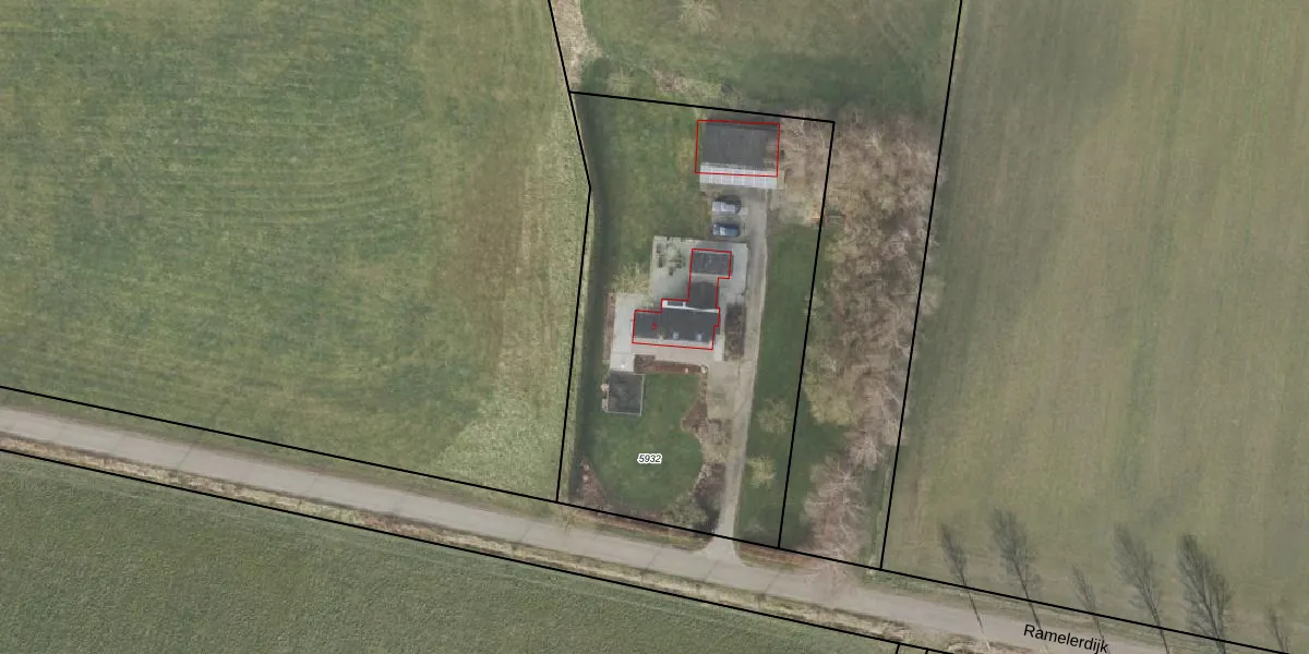Het perceel waarop Ramelerdijk 5 staat heeft een oppervlakte van 2200 m². Dit is een zeer groot perceel. De perceeloppervlakte wordt geregistreerd door het Kadaster. Gedetailleerde informatie over de maten van dit perceel kunt u vinden in het rapport Kadastrale kaart met maatvoering van Ramelerdijk 5.