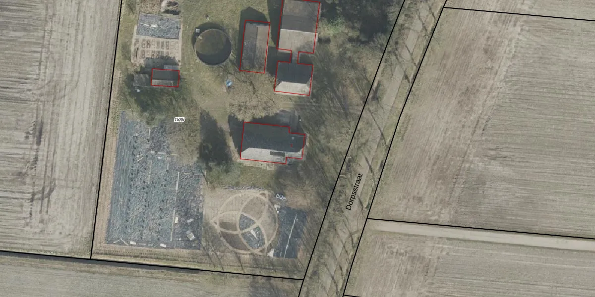Het perceel waarop Dorpsstraat 1 staat heeft een oppervlakte van 9445 m². Dit is een zeer groot perceel. De perceeloppervlakte wordt geregistreerd door het Kadaster. Gedetailleerde informatie over de maten van dit perceel kunt u vinden in het rapport Kadastrale kaart met maatvoering van Dorpsstraat 1.