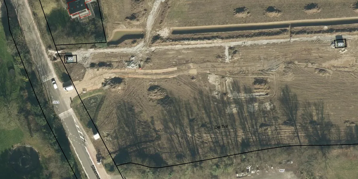 Het perceel waarop De Tol 1-a-4 staat heeft een oppervlakte van 5,0 ha. Dit is een zeer groot perceel. De perceeloppervlakte wordt geregistreerd door het Kadaster. Gedetailleerde informatie over de maten van dit perceel kunt u vinden in het rapport Kadastrale kaart met maatvoering van De Tol 1-a-4.