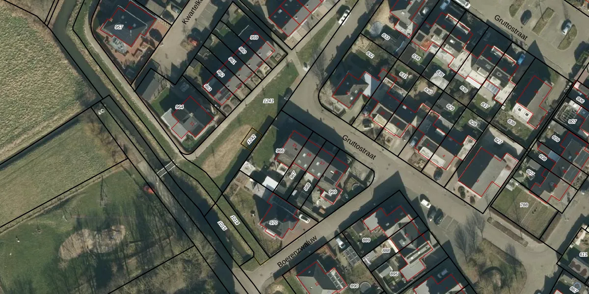 Gruttostraat 21 is gelegen op kadastraal perceel KWK02S966. Deze kadastrale aanduiding is uniek en wordt gebruikt door het Kadaster om eigendomsrechten en andere zakelijke rechten vast te leggen. Het perceel maakt onderdeel uit van de kadastrale gemeente Kerkwijk.