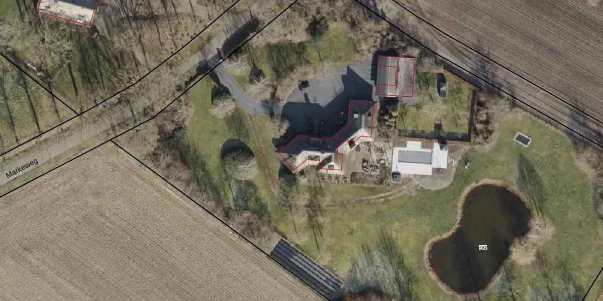 Het perceel waarop Markeweg 2 staat heeft een oppervlakte van 2,1 ha. Dit is een zeer groot perceel. De perceeloppervlakte wordt geregistreerd door het Kadaster. Gedetailleerde informatie over de maten van dit perceel kunt u vinden in het rapport Kadastrale kaart met maatvoering van Markeweg 2.