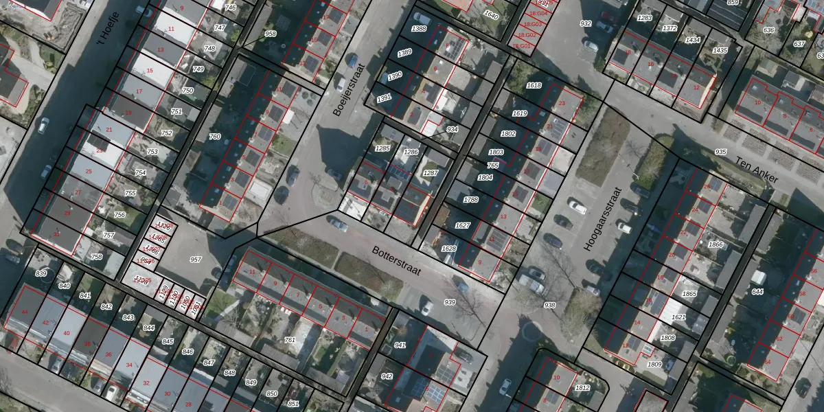 Het perceel waarop Botterstraat 2 staat heeft een oppervlakte van 180 m². Dit is een middelgroot perceel. De perceeloppervlakte wordt geregistreerd door het Kadaster. Gedetailleerde informatie over de maten van dit perceel kunt u vinden in het rapport Kadastrale kaart met maatvoering van Botterstraat 2.