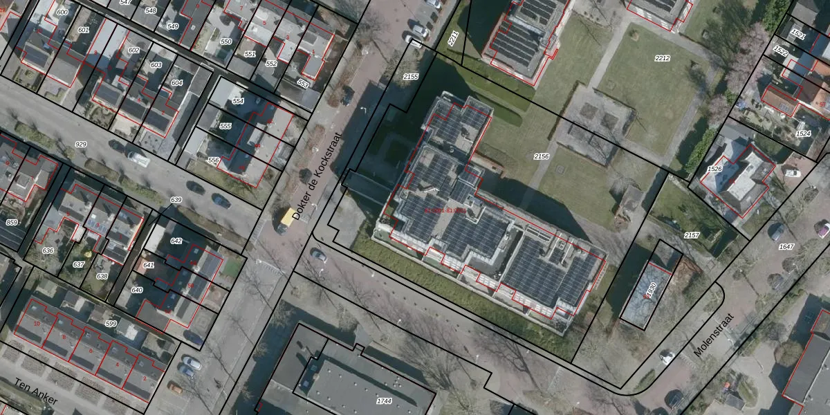 Het perceel waarop Dokter de Kockstraat 81-0020 staat heeft een oppervlakte van 3412 m². Dit is een zeer groot perceel. De perceeloppervlakte wordt geregistreerd door het Kadaster. Gedetailleerde informatie over de maten van dit perceel kunt u vinden in het rapport Kadastrale kaart met maatvoering van Dokter de Kockstraat 81-0020.