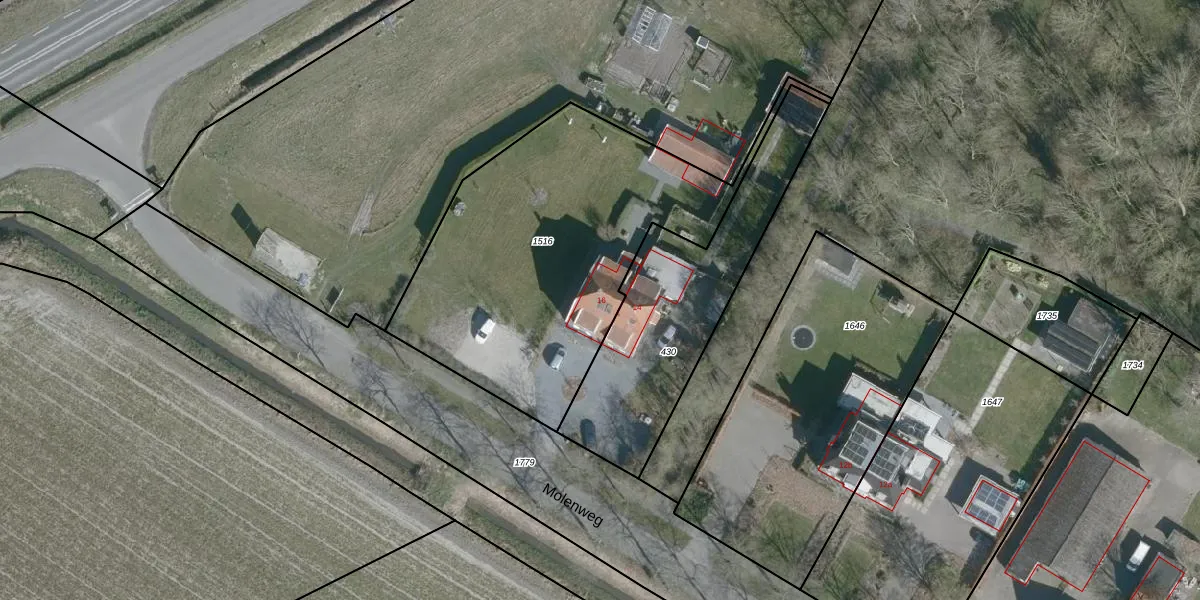 Het perceel waarop Molenweg 16 staat heeft een oppervlakte van 1630 m². Dit is een zeer groot perceel. De perceeloppervlakte wordt geregistreerd door het Kadaster. Gedetailleerde informatie over de maten van dit perceel kunt u vinden in het rapport Kadastrale kaart met maatvoering van Molenweg 16.