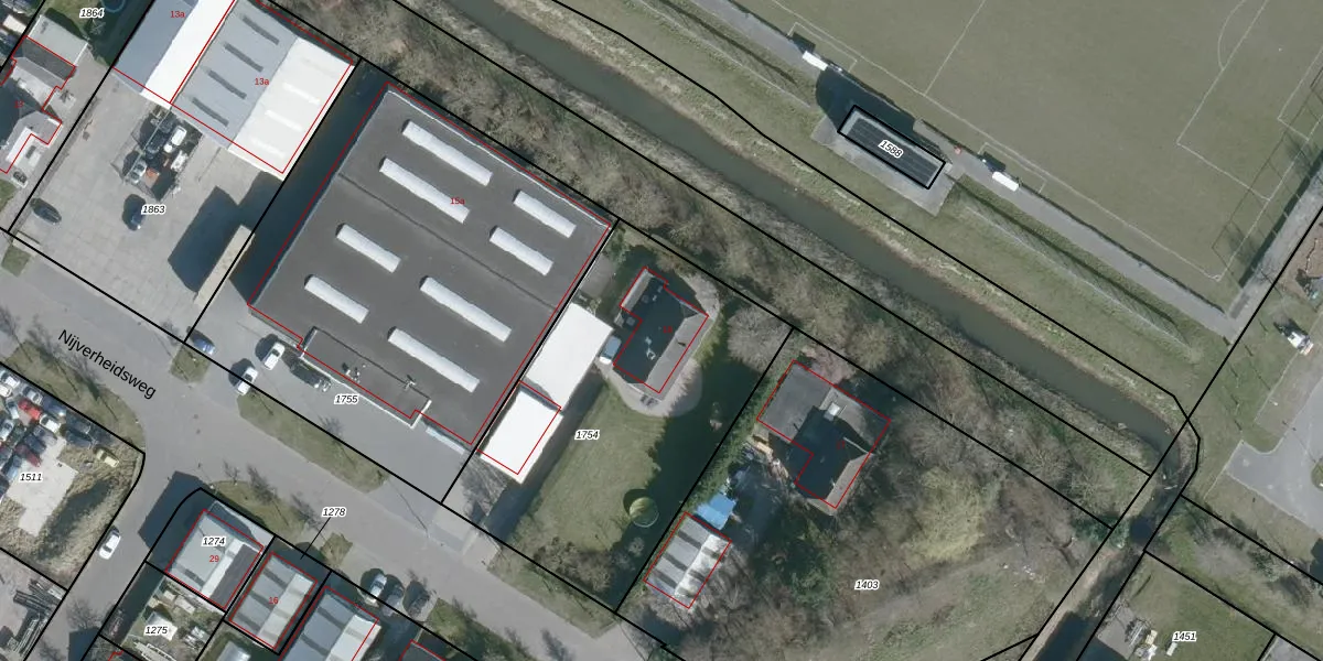 Het perceel waarop Nijverheidsweg 15 staat heeft een oppervlakte van 1585 m². Dit is een zeer groot perceel. De perceeloppervlakte wordt geregistreerd door het Kadaster. Gedetailleerde informatie over de maten van dit perceel kunt u vinden in het rapport Kadastrale kaart met maatvoering van Nijverheidsweg 15.