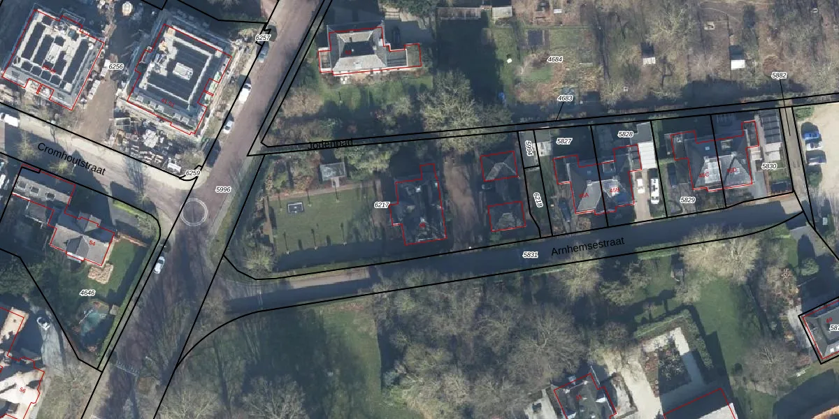 Het perceel waarop Arnhemsestraat 45 staat heeft een oppervlakte van 1935 m². Dit is een zeer groot perceel. De perceeloppervlakte wordt geregistreerd door het Kadaster. Gedetailleerde informatie over de maten van dit perceel kunt u vinden in het rapport Kadastrale kaart met maatvoering van Arnhemsestraat 45.