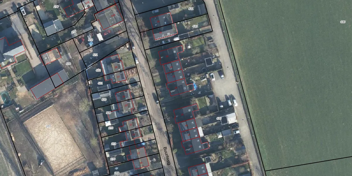 Het perceel waarop Buurtweg 20 staat heeft een oppervlakte van 6395 m². Dit is een zeer groot perceel. De perceeloppervlakte wordt geregistreerd door het Kadaster. Gedetailleerde informatie over de maten van dit perceel kunt u vinden in het rapport Kadastrale kaart met maatvoering van Buurtweg 20.