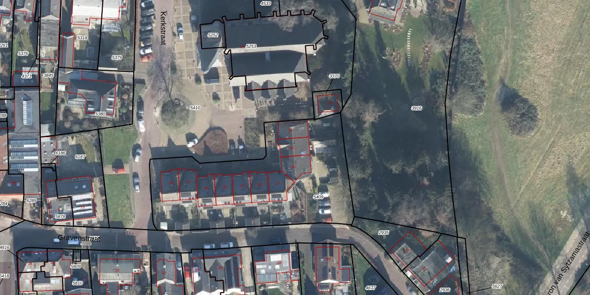 Het perceel waarop Kerkstraat 23 staat heeft een oppervlakte van 1875 m². Dit is een zeer groot perceel. De perceeloppervlakte wordt geregistreerd door het Kadaster. Gedetailleerde informatie over de maten van dit perceel kunt u vinden in het rapport Kadastrale kaart met maatvoering van Kerkstraat 23.