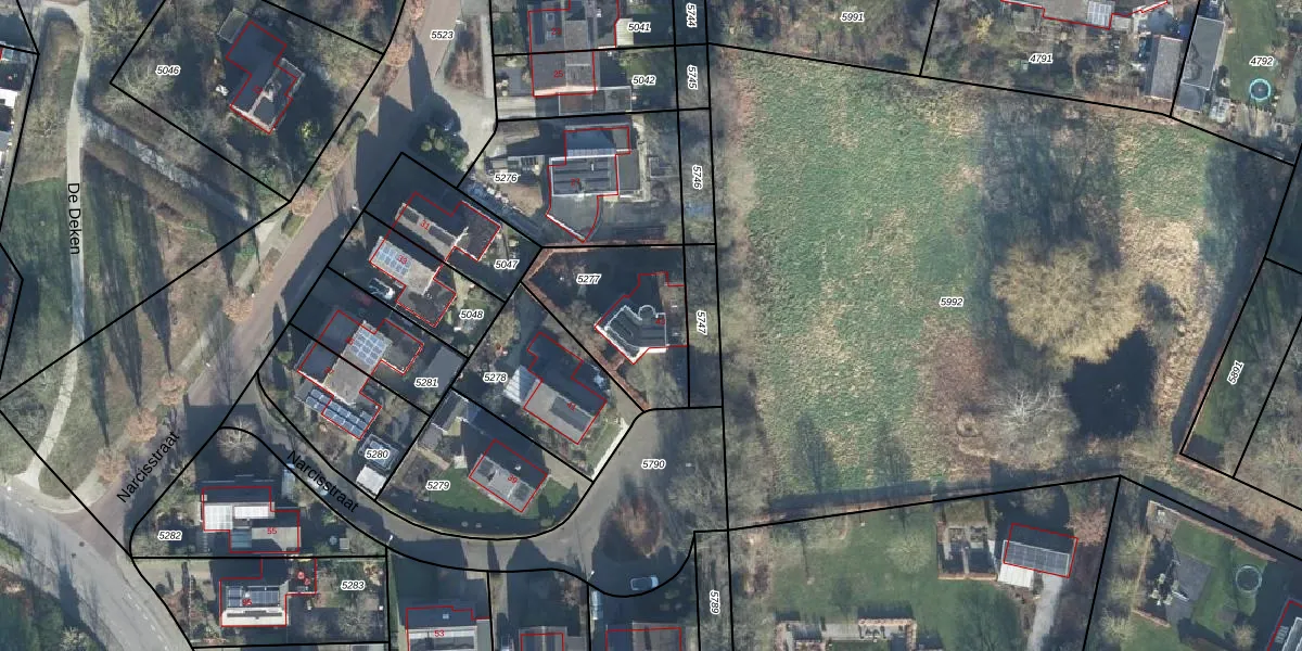 Narcisstraat 43 is gelegen op kadastraal perceel BMN01G5277. Deze kadastrale aanduiding is uniek en wordt gebruikt door het Kadaster om eigendomsrechten en andere zakelijke rechten vast te leggen. Het perceel maakt onderdeel uit van de kadastrale gemeente Brummen.