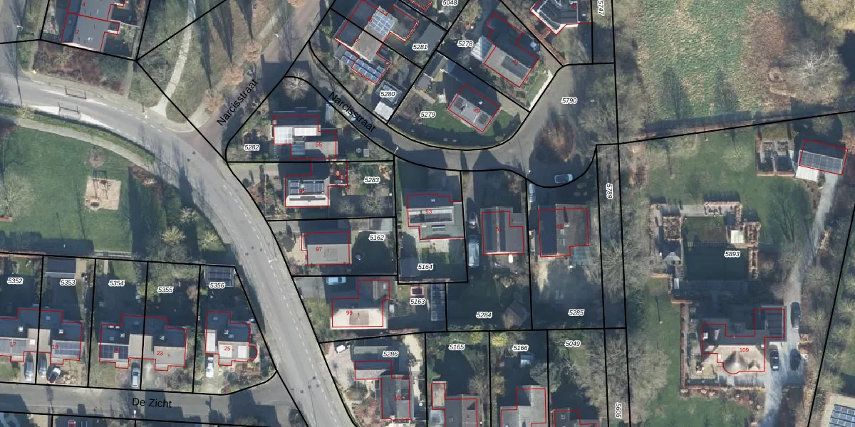 Narcisstraat 53 is gelegen op kadastraal perceel BMN01G5164. Deze kadastrale aanduiding is uniek en wordt gebruikt door het Kadaster om eigendomsrechten en andere zakelijke rechten vast te leggen. Het perceel maakt onderdeel uit van de kadastrale gemeente Brummen.