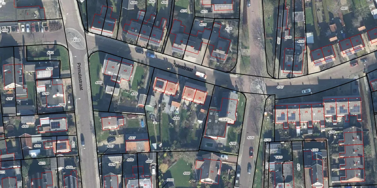 Tuinstraat 37 is gelegen op kadastraal perceel BMN01G4068. Deze kadastrale aanduiding is uniek en wordt gebruikt door het Kadaster om eigendomsrechten en andere zakelijke rechten vast te leggen. Het perceel maakt onderdeel uit van de kadastrale gemeente Brummen.
