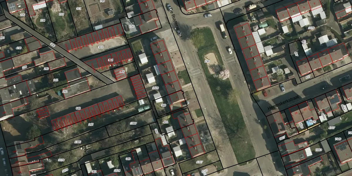 Het perceel waarop De Ruyterstraat 11 staat heeft een oppervlakte van 2399 m². Dit is een zeer groot perceel. De perceeloppervlakte wordt geregistreerd door het Kadaster. Gedetailleerde informatie over de maten van dit perceel kunt u vinden in het rapport Kadastrale kaart met maatvoering van De Ruyterstraat 11.