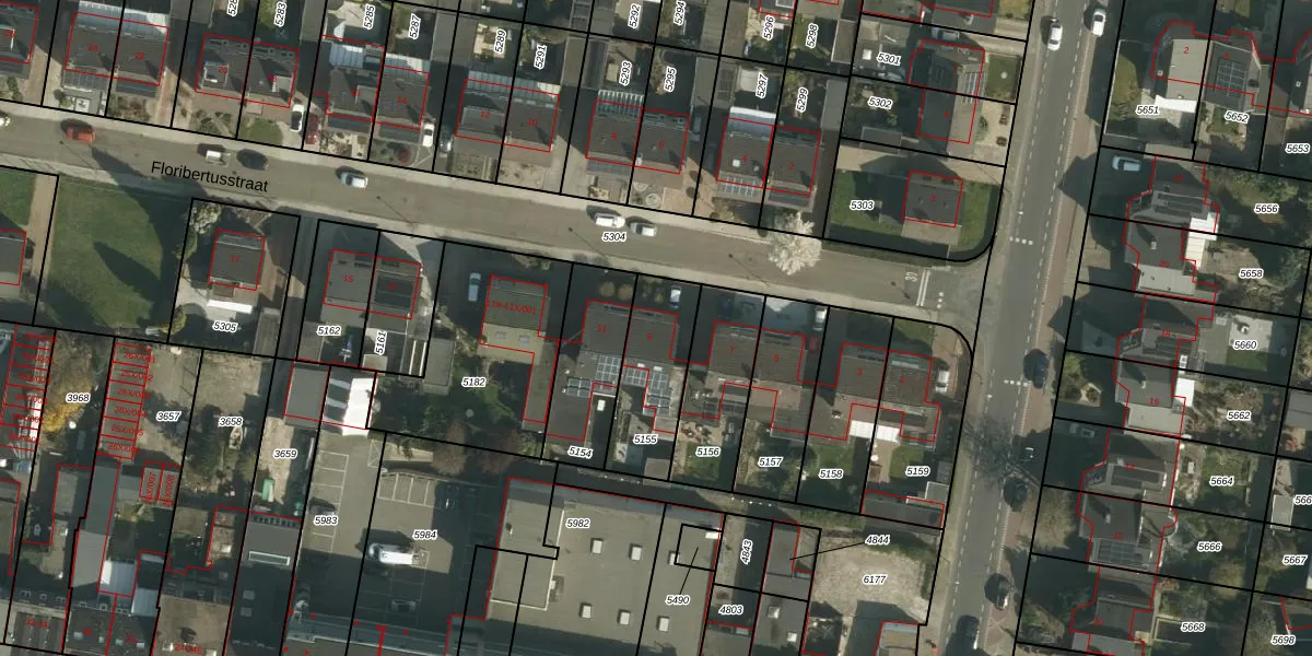Het perceel waarop Floribertusstraat 9 staat heeft een oppervlakte van 300 m². Dit is een groot perceel. De perceeloppervlakte wordt geregistreerd door het Kadaster. Gedetailleerde informatie over de maten van dit perceel kunt u vinden in het rapport Kadastrale kaart met maatvoering van Floribertusstraat 9.
