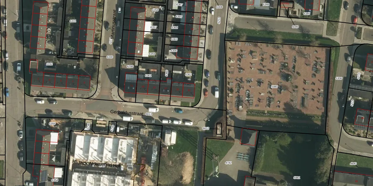 Het perceel waarop Gerbaldusstraat 21 staat heeft een oppervlakte van 363 m². Dit is een groot perceel. De perceeloppervlakte wordt geregistreerd door het Kadaster. Gedetailleerde informatie over de maten van dit perceel kunt u vinden in het rapport Kadastrale kaart met maatvoering van Gerbaldusstraat 21.