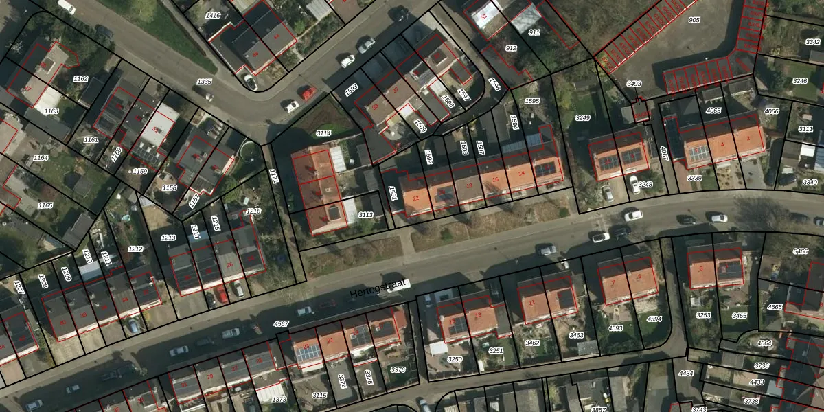 Het perceel waarop Hertogstraat 22 staat heeft een oppervlakte van 179 m². Dit is een middelgroot perceel. De perceeloppervlakte wordt geregistreerd door het Kadaster. Gedetailleerde informatie over de maten van dit perceel kunt u vinden in het rapport Kadastrale kaart met maatvoering van Hertogstraat 22.