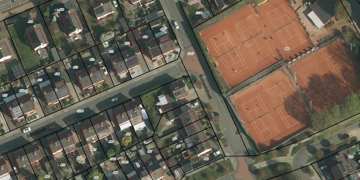 Het perceel waarop Junostraat 22 staat heeft een oppervlakte van 458 m². Dit is een groot perceel. De perceeloppervlakte wordt geregistreerd door het Kadaster. Gedetailleerde informatie over de maten van dit perceel kunt u vinden in het rapport Kadastrale kaart met maatvoering van Junostraat 22.
